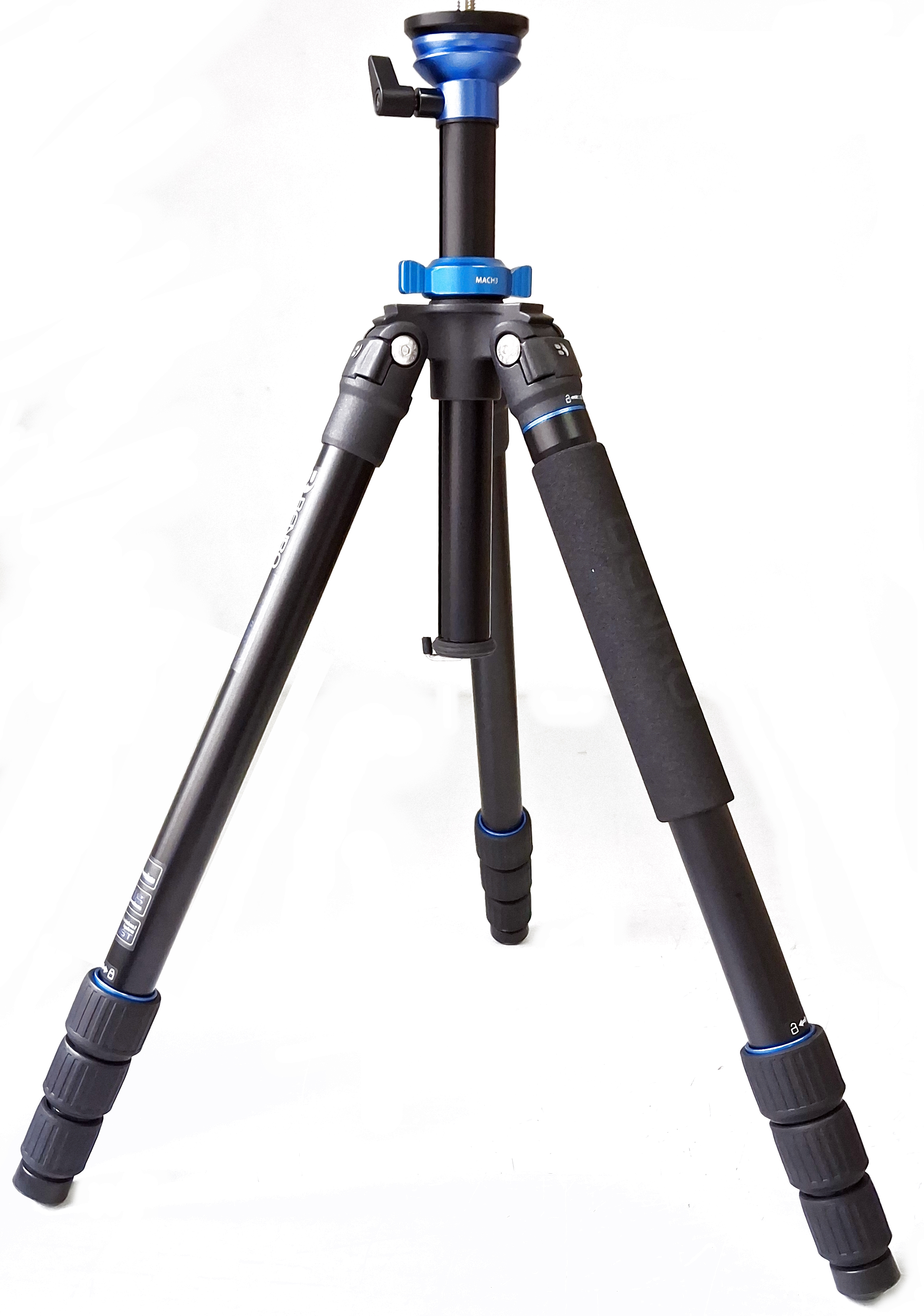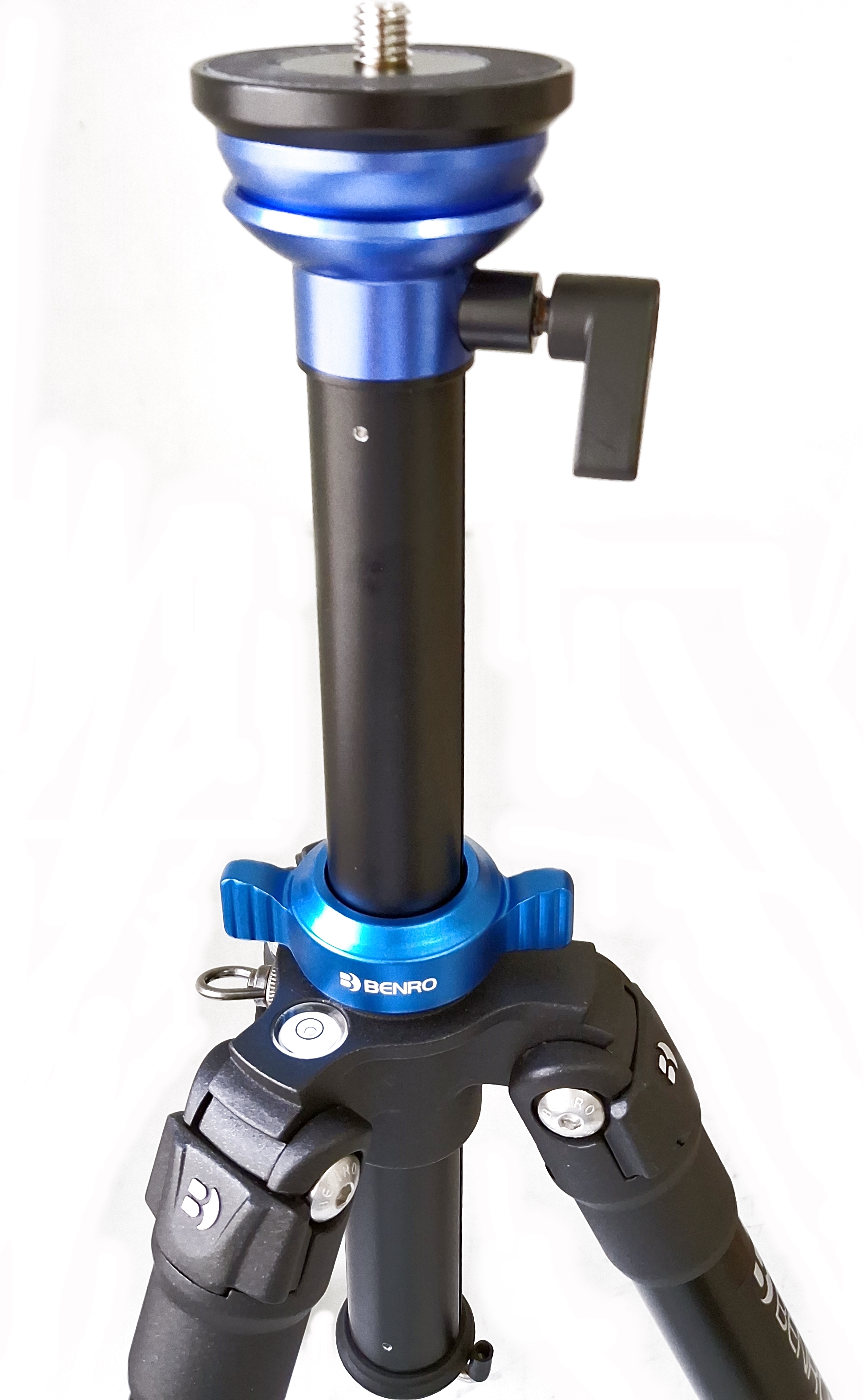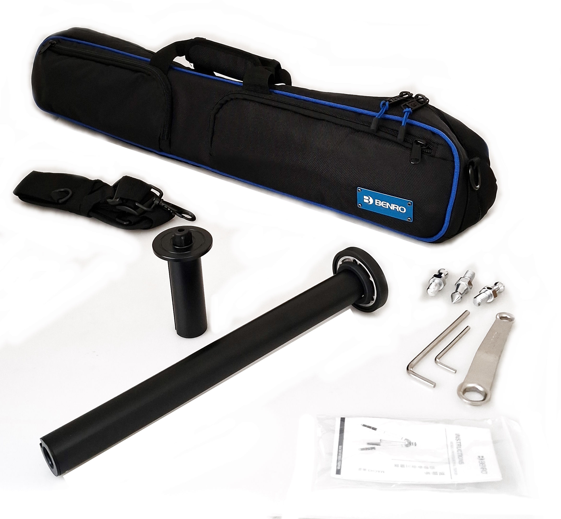 O tripé vem acompanhado de uma coluna extra com base de nivelamento, o que facilita ajustes precisos de ângulo.